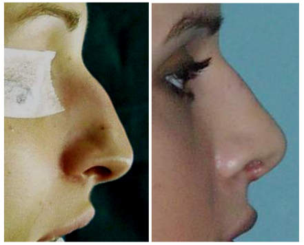 Slike 9. Povećavanje projekcije vrška nosa (prije i poslije zahvata). Profil nosa je dobiven samo naglašavanjem projekcije i rotacije vrška bez osteotomije nosnih kostiju.